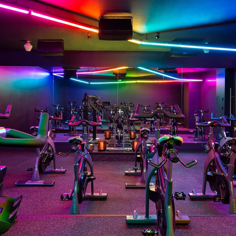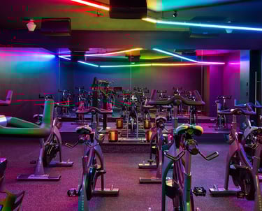 This space feels like a purpose-built club; everything has intention, and you can tell it was designed for people who actually show up and put in the work. It doesn’t rely on “pretty” to feel premium; it is professional grade, durable, clean, and consistent - day after day, class after class. The materials are doing the heavy lifting: commercial-grade flooring that can take constant traffic, sweat, and cleaning without looking tired, plus resilient surfaces that stay stable and quiet under bikes and during training. It’s the kind of environment where you walk in and immediately think, “Okay… we’re serious today.”
