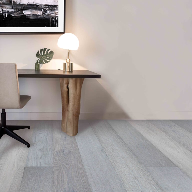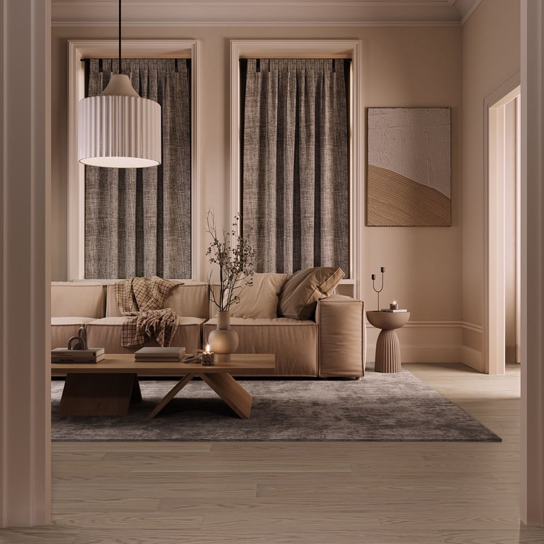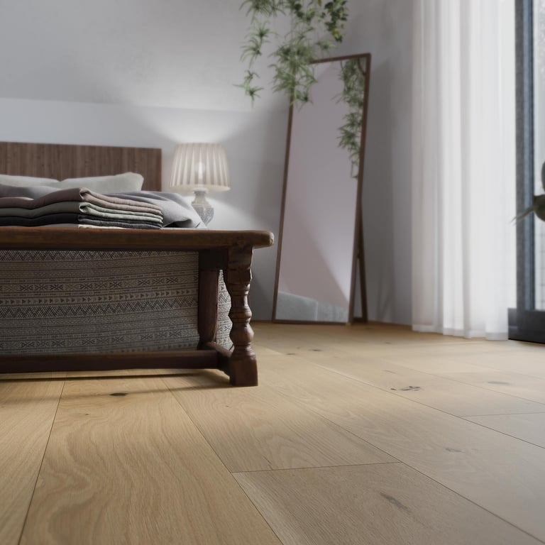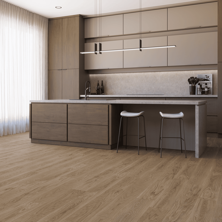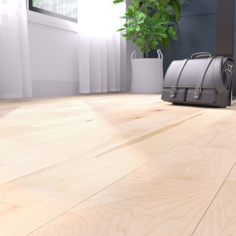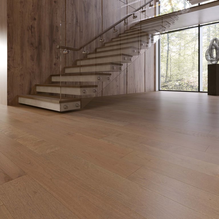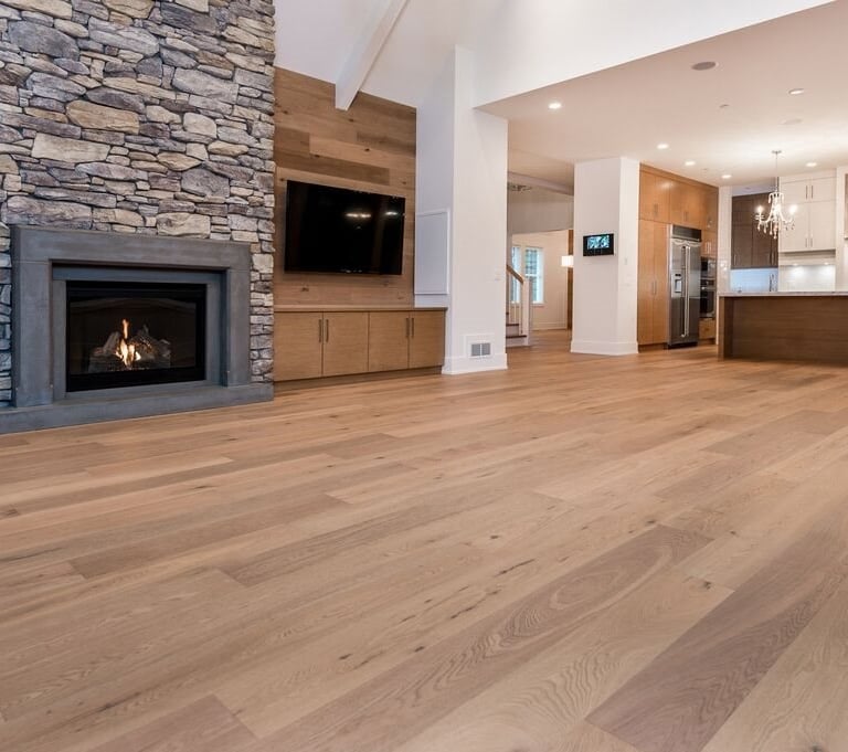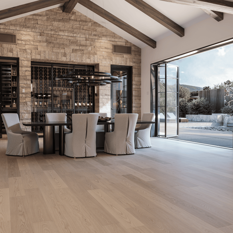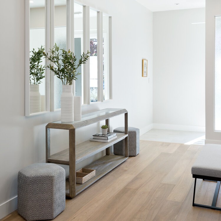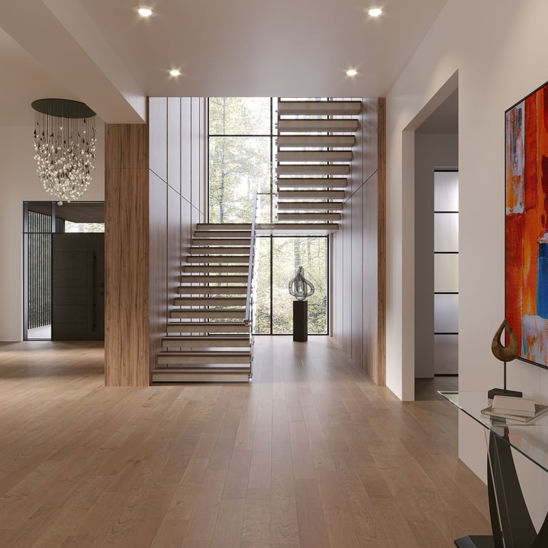 When the homeowner steps inside, it feels like the day drops off their shoulders—quiet, uncluttered, and instantly reassuring. There’s a subtle pride in that first glance, like, “Yep… this is exactly us.” The wide, light-toned planks set that mood: airy but grounded, warm without being yellow, and calm because the finish reads soft and natural rather than glossy or fussy. The gentle grain and barely-there variation keep it feeling real and lived-in, while the long board lines give a steady, forward momentum that makes the entry feel bigger and more intentional.